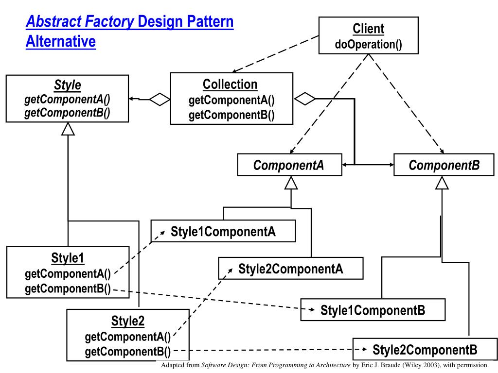 Abstract Factory Design PatternAlternative Client doOperation() Collection getComponentA() getComponentB() Style getComponentA() getComponentB() ComponentA ComponentB Style1ComponentA Style1 getComponentA() getComponentB() Style2ComponentA Style1ComponentB Style2 getComponentA() getComponentB() Style2ComponentB Adapted from Software Design: From Programming to Architecture by Eric J. Braude (Wiley 2003), with permission.