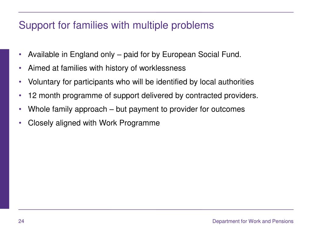 Available in England only – paid for by European Social Fund. Aimed at families with history of worklessness Voluntary for participants who will be identified by local authorities 12 month programme of support delivered by contracted providers. Whole family approach – but payment to provider for outcomes Closely aligned with Work Programme Support for families with multiple problems
