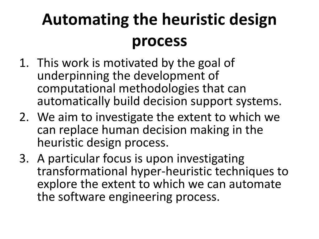 Automating the heuristic design process • This work is motivated by the goal of underpinning the development of computational methodologies that can automatically build decision support systems. • We aim to investigate the extent to which we can replace human decision making in the heuristic design process. • A particular focus is upon investigating transformational hyper-heuristic techniques to explore the extent to which we can automate the software engineering process.