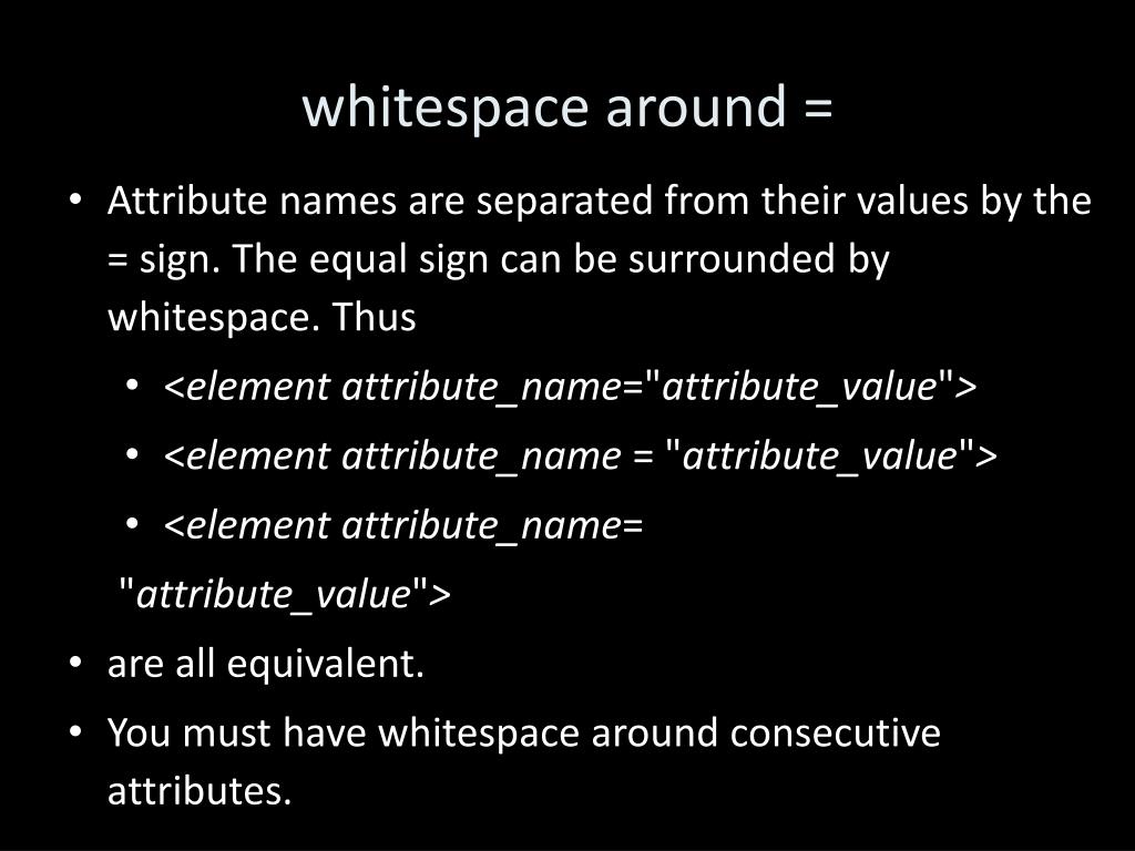 whitespace around = • Attribute names are separated from their values by the = sign. The equal sign can be surrounded by whitespace. Thus • <elementattribute_name="attribute_value"> • <elementattribute_name = "attribute_value"> • <elementattribute_name= • "attribute_value"> • are all equivalent. • You must have whitespace around consecutive attributes.