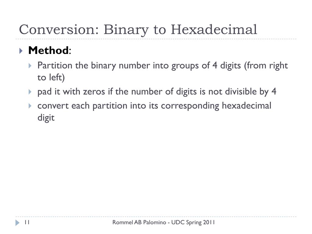 Conversion: Binary to Hexadecimal • Method: • Partition the binary number into groups of 4 digits (from right to left) • pad it with zeros if the number of digits is not divisible by 4 • convert each partition into its corresponding hexadecimal digit Rommel AB Palomino - UDC Spring 2011