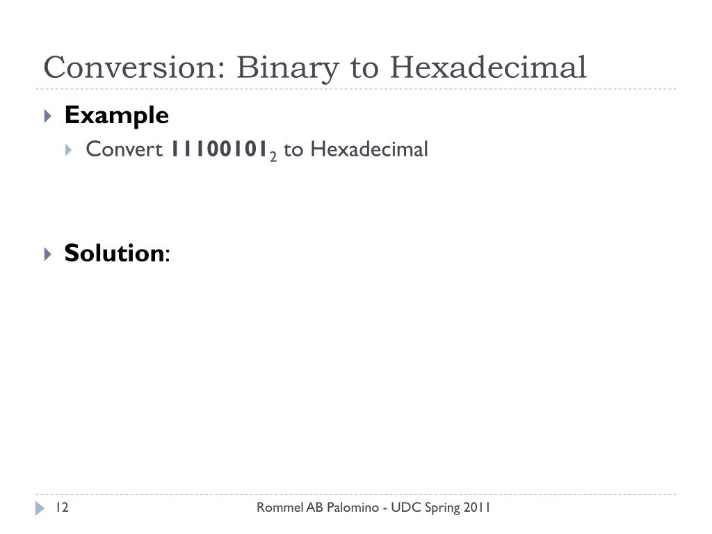 Conversion: Binary to Hexadecimal • Example • Convert 111001012 to Hexadecimal • Solution: Rommel AB Palomino - UDC Spring 2011