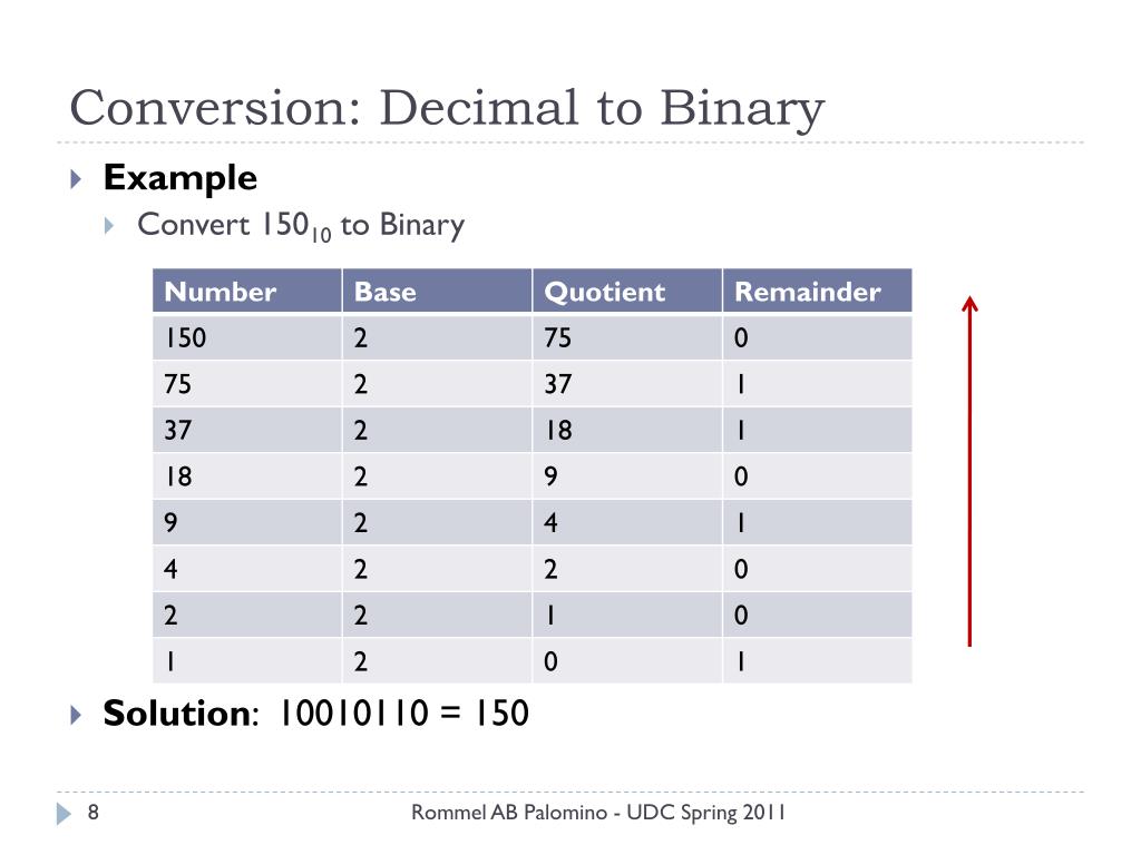 Conversion: Decimal to Binary • Example • Convert 15010 to Binary • Solution: 10010110 = 150 Rommel AB Palomino - UDC Spring 2011