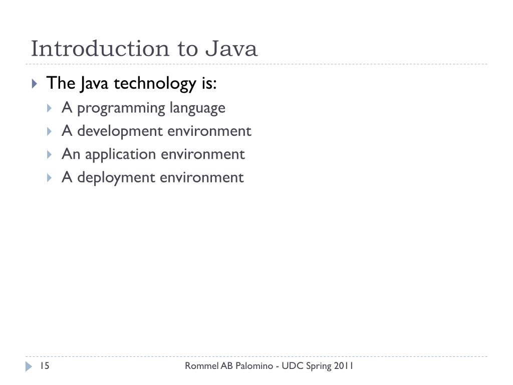 Introduction to Java • The Java technology is: • A programming language • A development environment • An application environment • A deployment environment Rommel AB Palomino - UDC Spring 2011