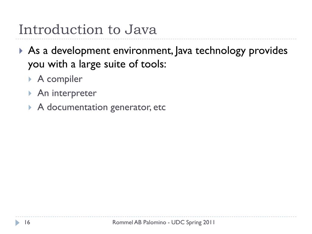 Introduction to Java • As a development environment, Java technology provides you with a large suite of tools: • A compiler • An interpreter • A documentation generator, etc Rommel AB Palomino - UDC Spring 2011