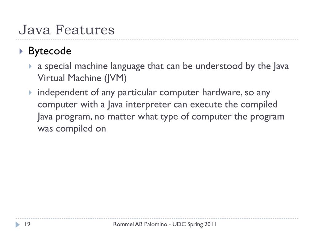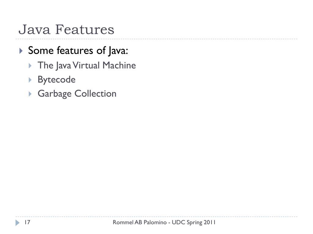 Java Features • Some features of Java: • The Java Virtual Machine • Bytecode • Garbage Collection Rommel AB Palomino - UDC Spring 2011