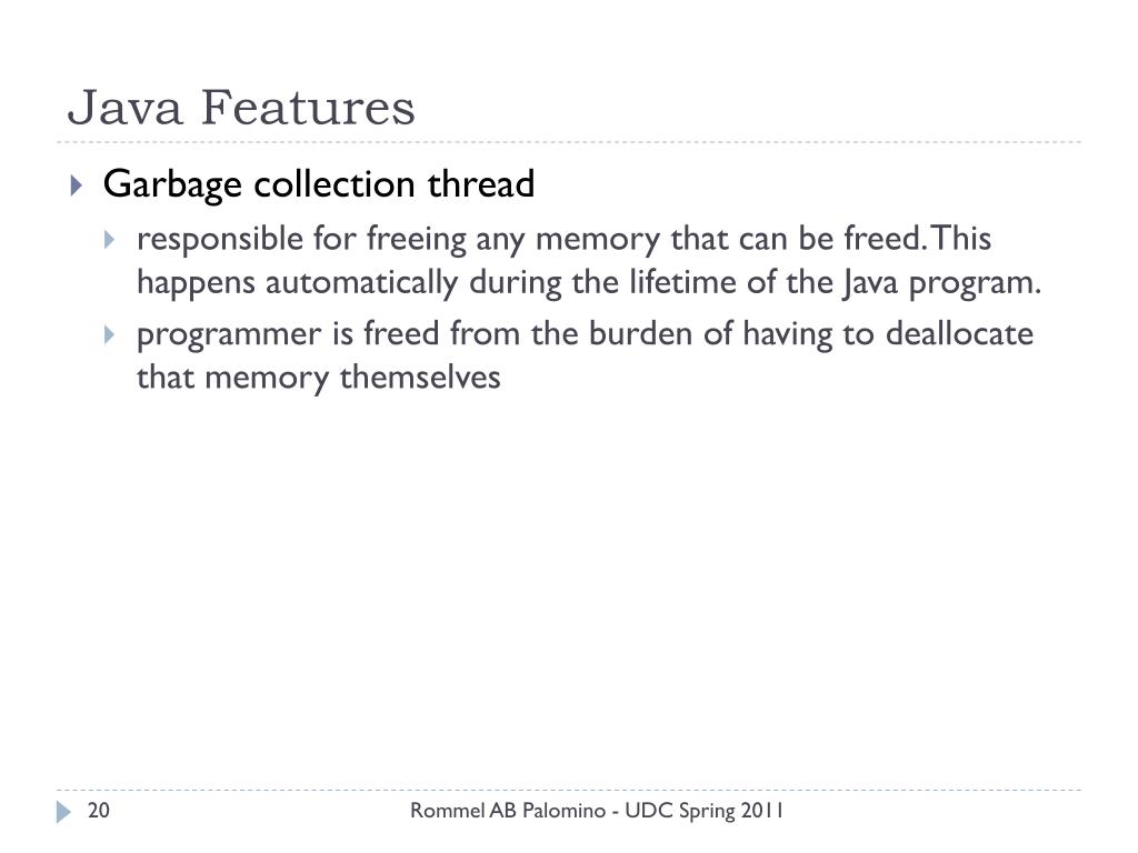 Java Features • Garbage collection thread • responsible for freeing any memory that can be freed. This happens automatically during the lifetime of the Java program. • programmer is freed from the burden of having to deallocate that memory themselves Rommel AB Palomino - UDC Spring 2011