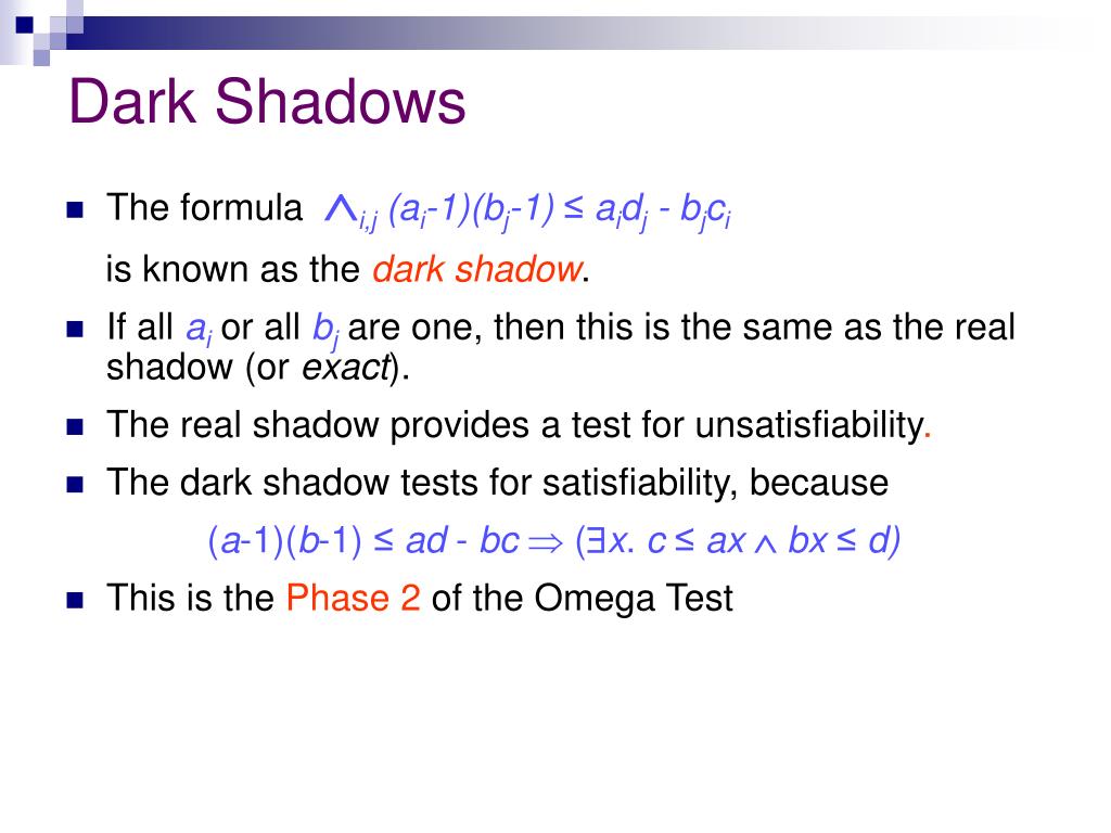Dark Shadows • The formula i,j (ai-1)(bj-1) ≤ aidj - bjci is known as the dark shadow. • If all aior all bjare one, then this is the same as the real shadow (or exact). • The real shadow provides a test for unsatisfiability. • The dark shadow tests for satisfiability, because (a-1)(b-1) ≤ad - bc (x. c ≤ax bx ≤d) • This is the Phase 2 of the Omega Test