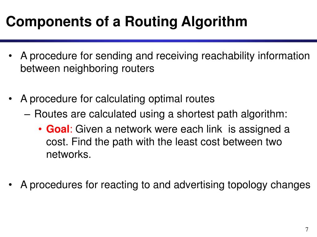 Components of a Routing Algorithm • A procedure for sending and receiving reachability information between neighboring routers • A procedure for calculating optimal routes • Routes are calculated using a shortest path algorithm: • Goal: Given a network were each link is assigned a cost. Find the path with the least cost between two networks. • A procedures for reacting to and advertising topology changes