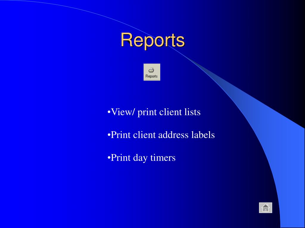 Reports • View/ print client lists • Print client address labels • Print day timers