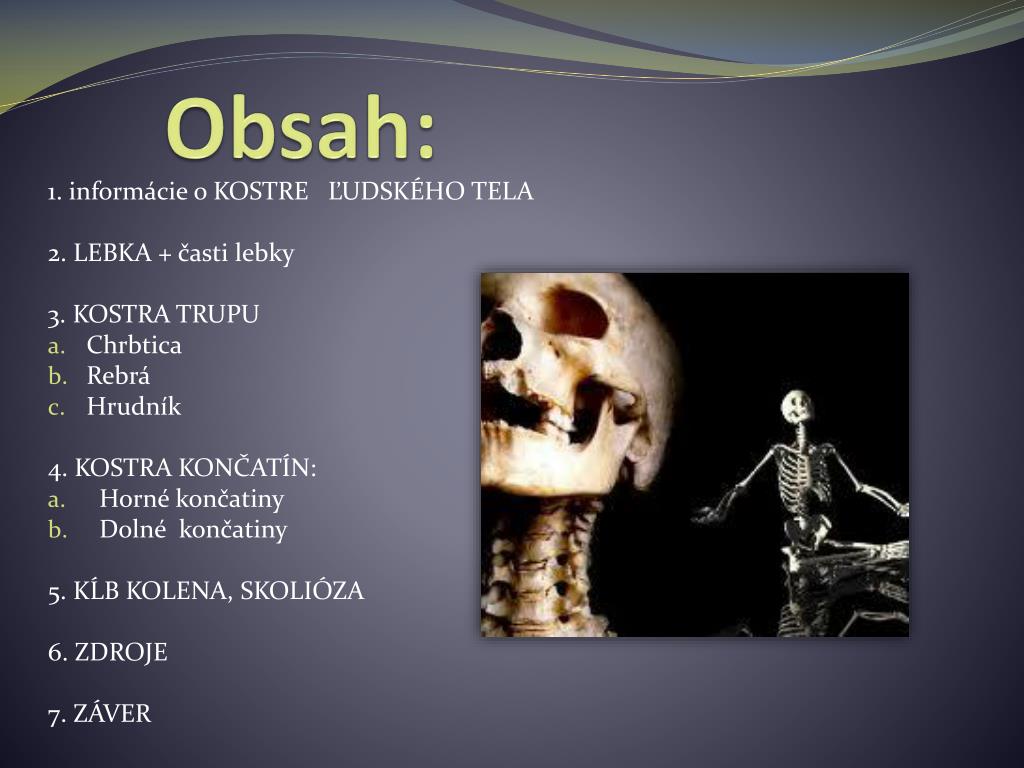 Obsah: 1. informácie o KOSTRE ĽUDSKÉHO TELA 2. LEBKA + časti lebky 3. KOSTRA TRUPU Chrbtica Rebrá Hrudník 4. KOSTRA KONČATÍN: Horné končatiny Dolné končatiny 5. KĹB KOLENA, SKOLIÓZA 6. ZDROJE 7. ZÁVER