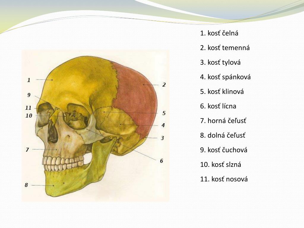 1. kosť čelná2. kosť temenná3. kosť tylová4. kosť spánková5. kosť klinová6. kosť lícna7. horná čeľusť8. dolná čeľusť9. kosť čuchová10. kosť slzná11. kosť nosová