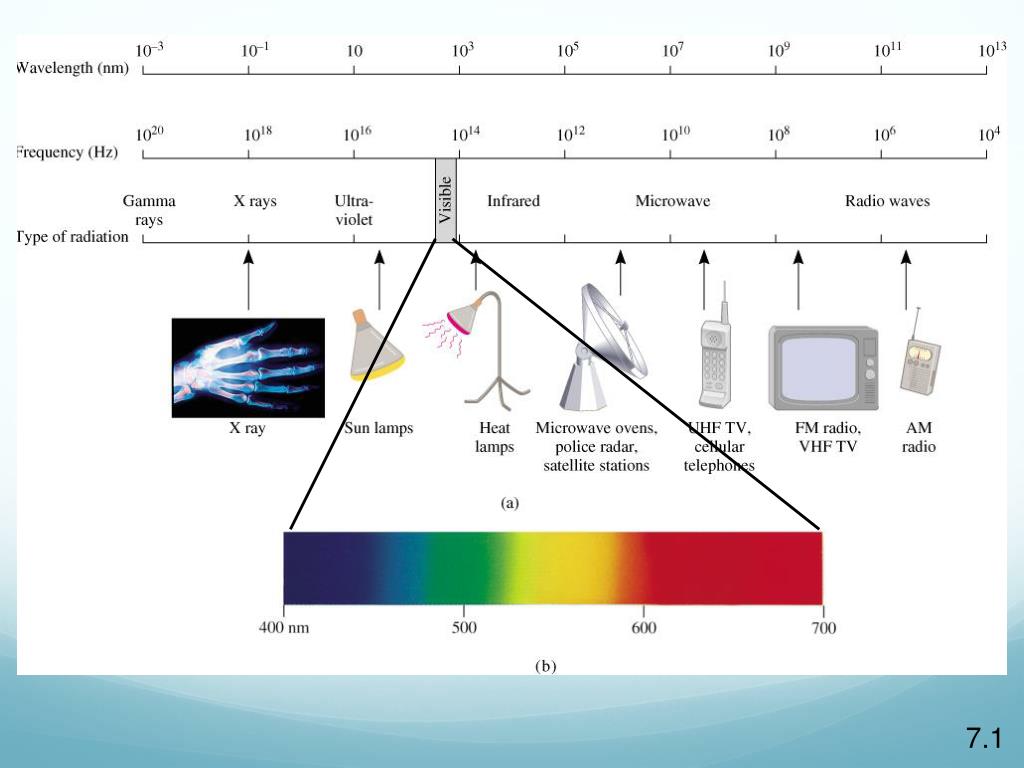 Maxwell (1873), proposed that visible light consists of electromagnetic waves. Electromagnetic radiation is the emission and transmission of energy in the form of electromagnetic waves. Speed of light (c) in vacuum = 3.00 x 108 m/s All electromagnetic radiation l x n = c 7.1
