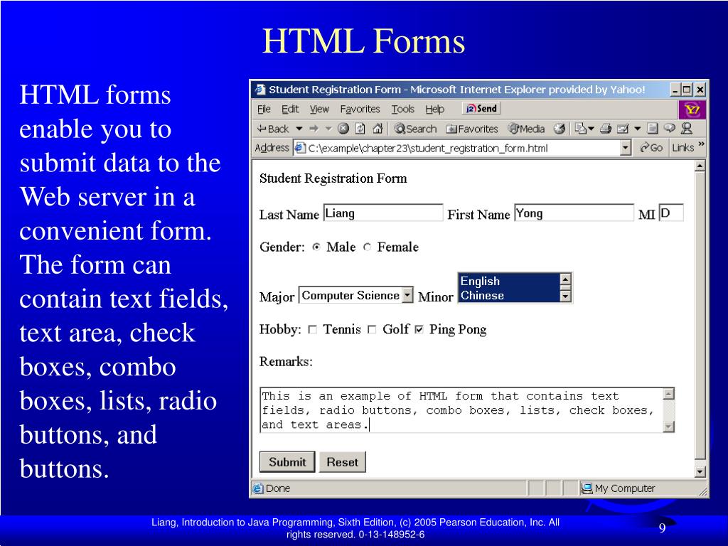 HTML Forms HTML forms enable you to submit data to the Web server in a convenient form. The form can contain text fields, text area, check boxes, combo boxes, lists, radio buttons, and buttons.