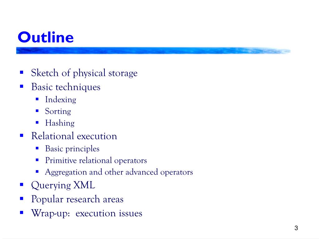 Outline • Sketch of physical storage • Basic techniques • Indexing • Sorting • Hashing • Relational execution • Basic principles • Primitive relational operators • Aggregation and other advanced operators • Querying XML • Popular research areas • Wrap-up: execution issues