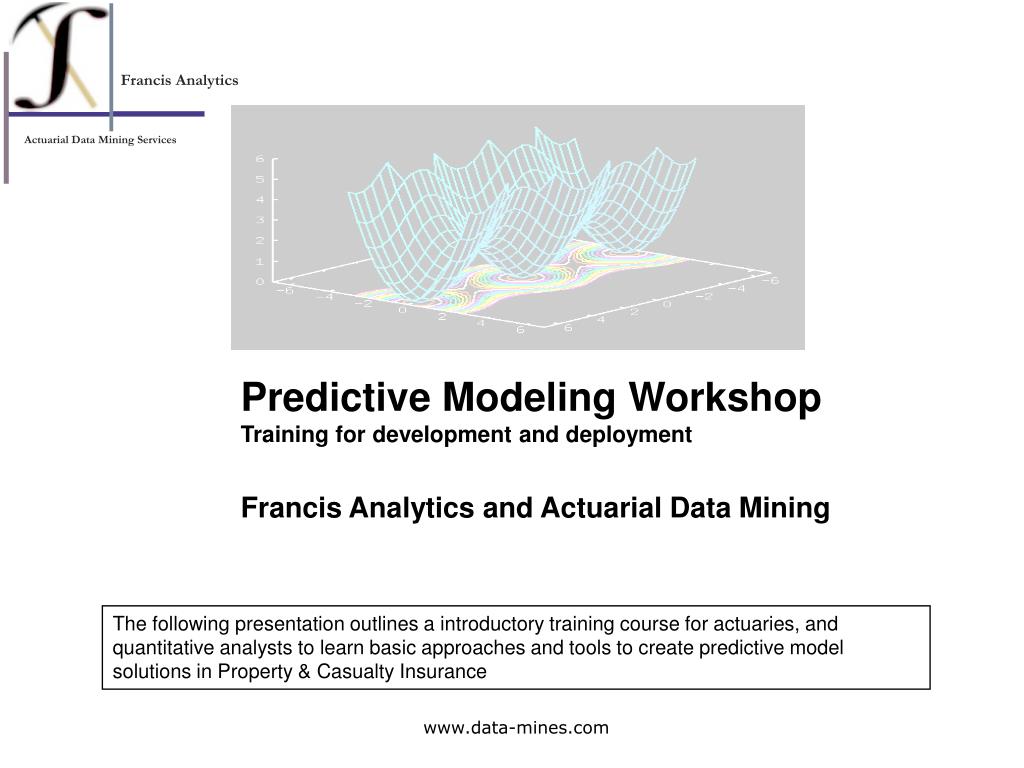 Predictive Modeling WorkshopTraining for development and deployment Francis Analytics and Actuarial Data Mining The following presentation outlines a introductory training course for actuaries, and quantitative analysts to learn basic approaches and tools to create predictive model solutions in Property & Casualty Insurance www.data-mines.com