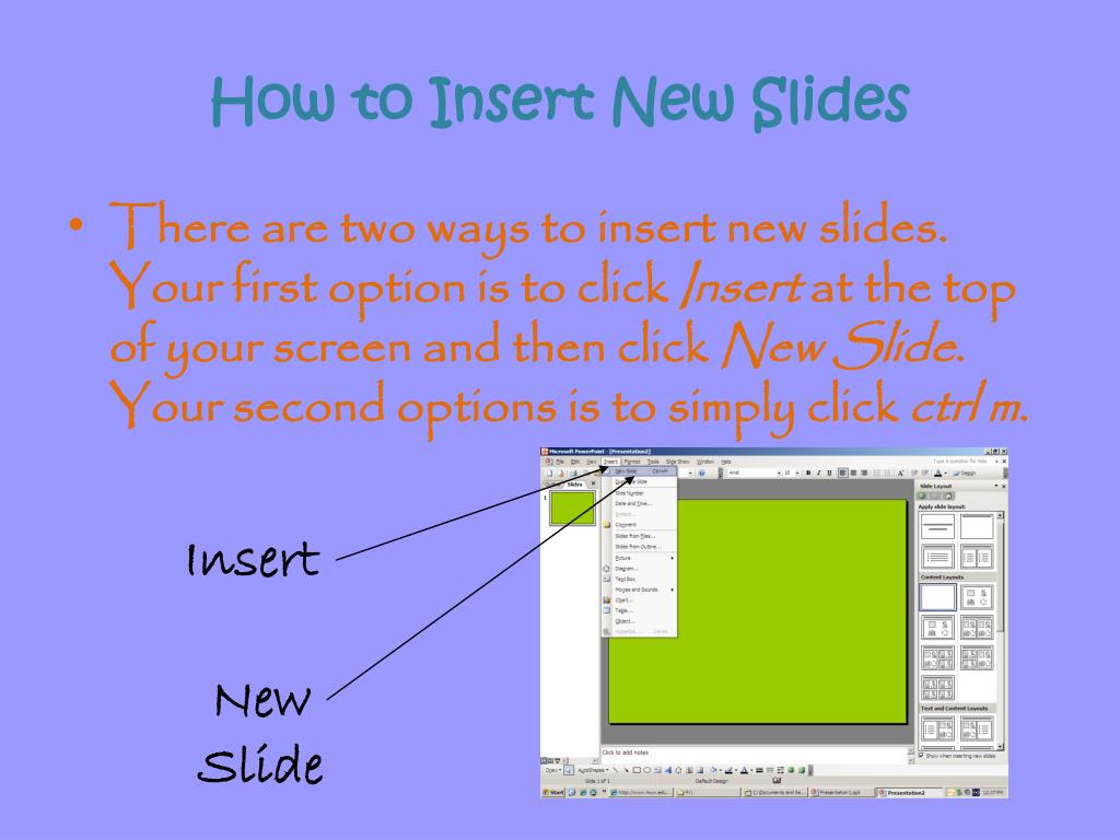 How to Insert New Slides • There are two ways to insert new slides. Your first option is to click Insert at the top of your screen and then click New Slide. Your second options is to simply click ctrl m. Insert New Slide