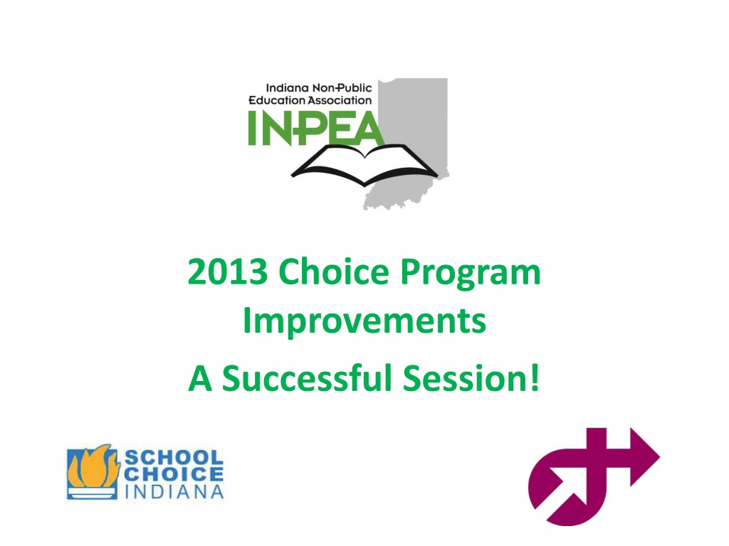 2013 Choice Program Improvements A S uccessful Session!. Webinar Partners. Indiana Non-Public Education Association (INPEA) John Elcesser School Choice Indiana (SCI) Marissa Lynch Indiana Catholic Conference (ICC) Glenn Tebbe. Before we Start: Disclaimers.