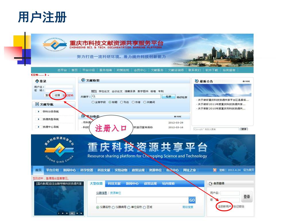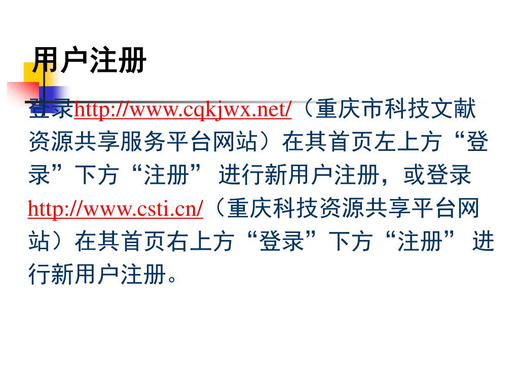 用户注册 登录http://www.cqkjwx.net/(重庆市科技文献资源共享服务平台网站)在其首页左上方“登录”下方“注册” 进行新用户注册,或登录http://www.csti.cn/(重庆科技资源共享平台网站)在其首页右上方“登录”下方“注册” 进行新用户注册。 http://www.cqkjwx.net/