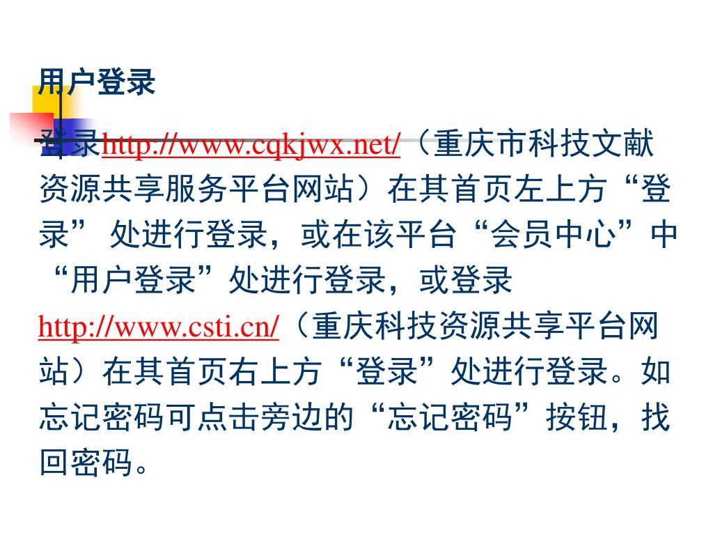 用户登录 登录http://www.cqkjwx.net/(重庆市科技文献资源共享服务平台网站)在其首页左上方“登录” 处进行登录,或在该平台“会员中心”中“用户登录”处进行登录,或登录http://www.csti.cn/(重庆科技资源共享平台网站)在其首页右上方“登录”处进行登录。如忘记密码可点击旁边的“忘记密码”按钮,找回密码。 http://www.cqkjwx.net/