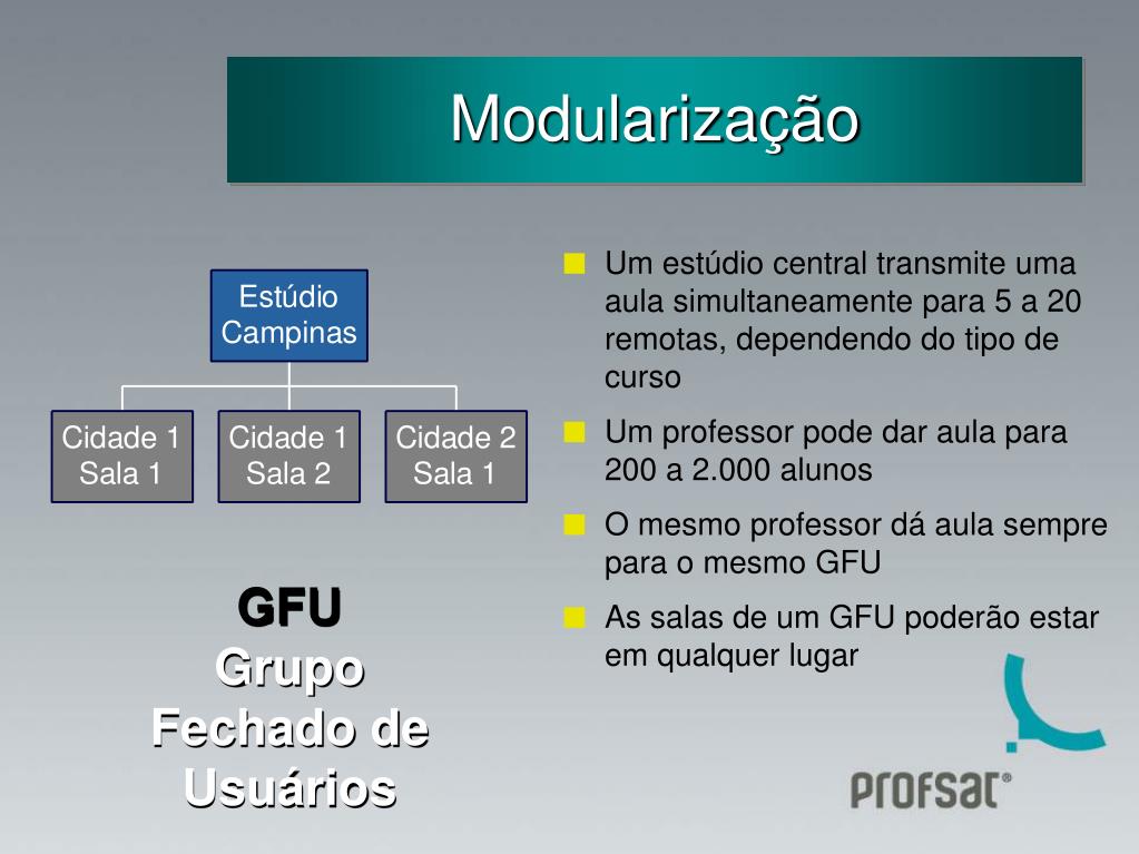 Modularização • Um estúdio central transmite uma aula simultaneamente para 5 a 20 remotas, dependendo do tipo de curso • Um professor pode dar aula para 200 a 2.000 alunos • O mesmo professor dá aula sempre para o mesmo GFU • As salas de um GFU poderão estar em qualquer lugar GFU Grupo Fechado de Usuários