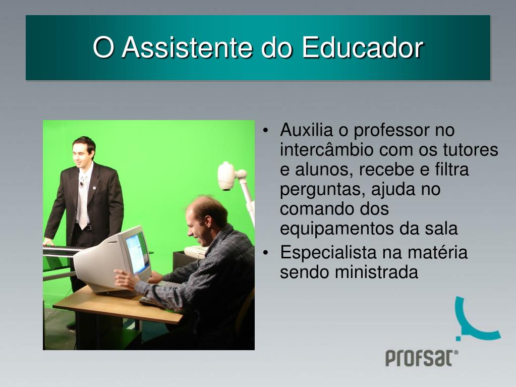 O Assistente do Educador • Auxilia o professor no intercâmbio com os tutores e alunos, recebe e filtra perguntas, ajuda no comando dos equipamentos da sala • Especialista na matéria sendo ministrada