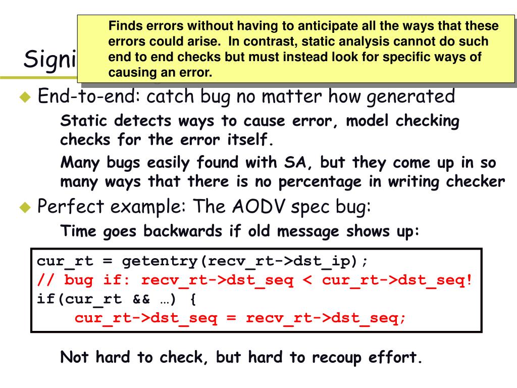 Significant model checking win #2. • Finds errors without having to anticipate all the ways that these errors could arise. In contrast, static analysis cannot do such end to end checks but must instead look for specific ways of causing an error. • End-to-end: catch bug no matter how generated • Static detects ways to cause error, model checking checks for the error itself. • Many bugs easily found with SA, but they come up in so many ways that there is no percentage in writing checker • Perfect example: The AODV spec bug: • Time goes backwards if old message shows up: • Not hard to check, but hard to recoup effort. cur_rt = getentry(recv_rt->dst_ip); // bug if: recv_rt->dst_seq < cur_rt->dst_seq! if(cur_rt && …) { cur_rt->dst_seq = recv_rt->dst_seq;
