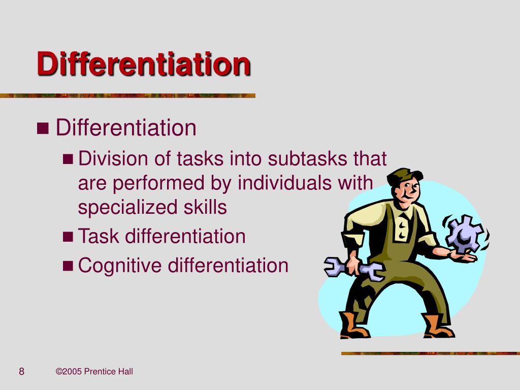 Differentiation • Differentiation • Division of tasks into subtasks that are performed by individuals with specialized skills • Task differentiation • Cognitive differentiation