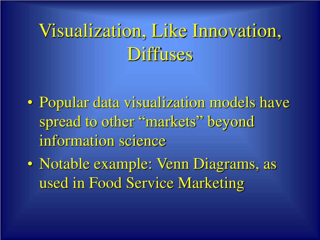 Visualization, Like Innovation, Diffuses • Popular data visualization models have spread to other “markets” beyond information science • Notable example: Venn Diagrams, as used in Food Service Marketing