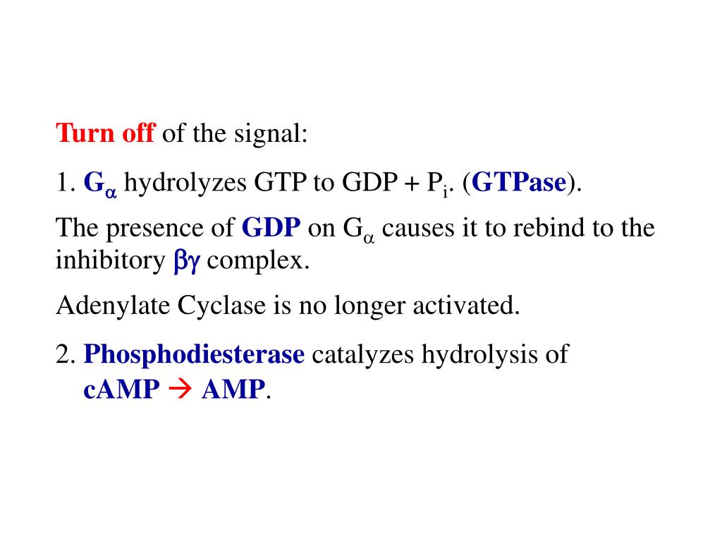 Turn off of the signal: 1. Ga hydrolyzes GTP to GDP + Pi. (GTPase). The presence of GDP on Ga causes it to rebind to the inhibitory bgcomplex. Adenylate Cyclase is no longer activated. 2. Phosphodiesterasecatalyzes hydrolysis of cAMPAMP.