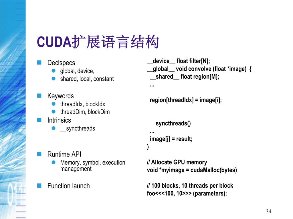 CUDA扩展语言结构 __device__ float filter[N]; __global__ void convolve (float *image) { __shared__ float region[M]; ... region[threadIdx] = image[i]; __syncthreads() ... image[j] = result; } // Allocate GPU memory void *myimage = cudaMalloc(bytes) // 100 blocks, 10 threads per block foo<<<100, 10>>> (parameters); • Declspecs • global, device, • shared, local, constant • Keywords • threadIdx, blockIdx • threadDim, blockDim • Intrinsics • __syncthreads • Runtime API • Memory, symbol, execution management • Function launch