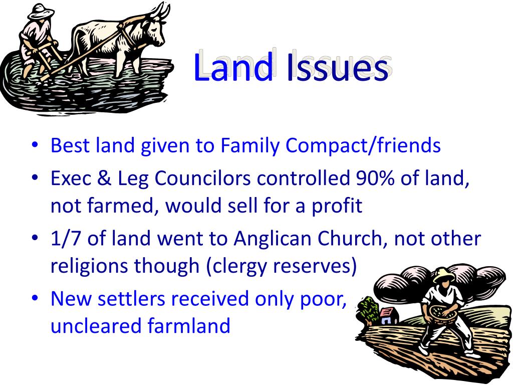 LandIssues • Best land given to Family Compact/friends • Exec & Leg Councilors controlled 90% of land, not farmed, would sell for a profit • 1/7 of land went to Anglican Church, not other religions though (clergy reserves) • New settlers received only poor, uncleared farmland