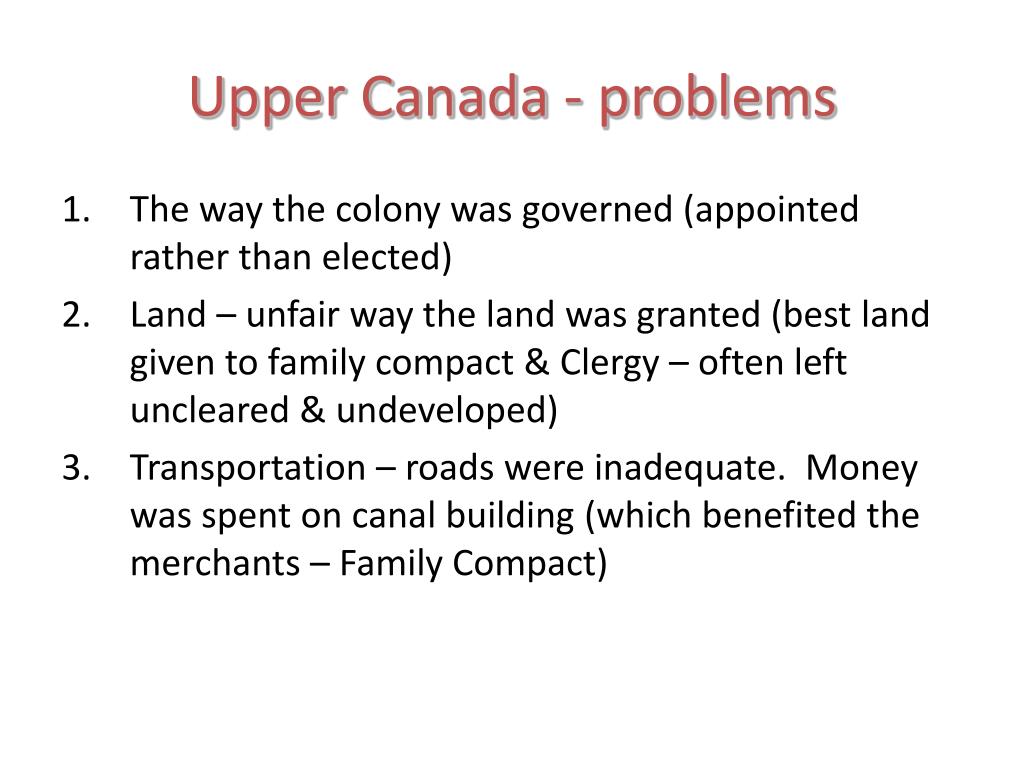 Upper Canada - problems • The way the colony was governed (appointed rather than elected) • Land – unfair way the land was granted (best land given to family compact & Clergy – often left uncleared & undeveloped) • Transportation – roads were inadequate. Money was spent on canal building (which benefited the merchants – Family Compact)