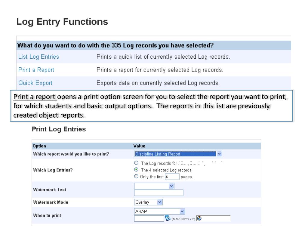 The log entry result screen will show you the number of log entries that meet the selected criteria and then provide options for what you want to do with that selection of records. List Log entries will print to the screen all log entries and show the entry date, subtype code, student name (as a link), author’s name, title and contents of the Log Entry text box.