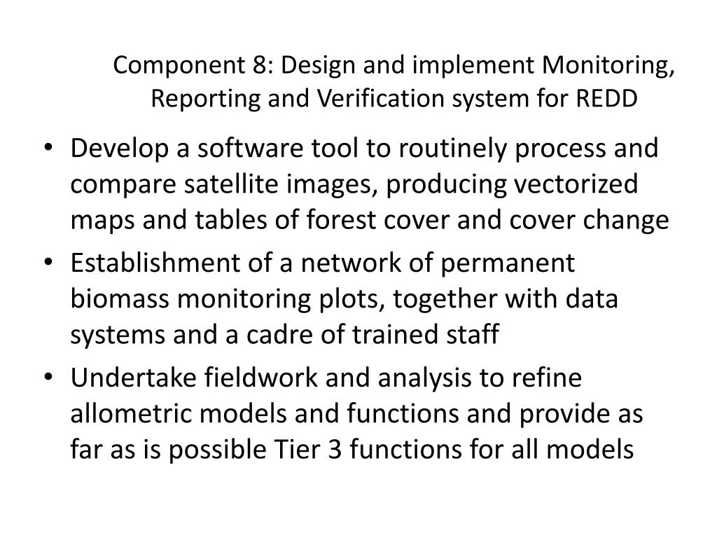 Component 8: Design and implement Monitoring, Reporting and Verification system for REDD • Develop a software tool to routinely process and compare satellite images, producing vectorized maps and tables of forest cover and cover change • Establishment of a network of permanent biomass monitoring plots, together with data systems and a cadre of trained staff • Undertake fieldwork and analysis to refine allometric models and functions and provide as far as is possible Tier 3 functions for all models