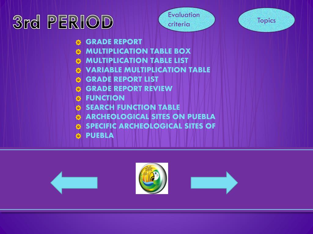 3rd PERIOD • Evaluation criteria Topics GRADE REPORT MULTIPLICATION TABLE BOX MULTIPLICATION TABLE LIST VARIABLE MULTIPLICATION TABLE GRADE REPORT LIST GRADE REPORT REVIEW FUNCTION SEARCH FUNCTION TABLE ARCHEOLOGICAL SITES ON PUEBLA SPECIFIC ARCHEOLOGICAL SITES OF PUEBLA