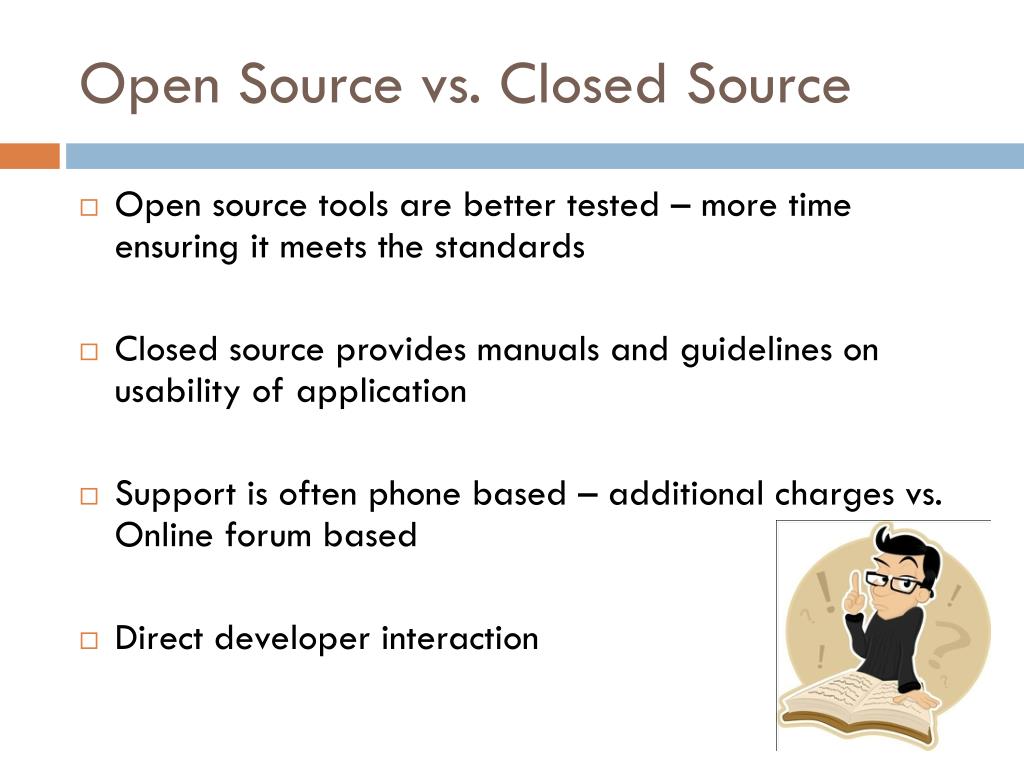 Open Source vs. Closed Source • Open source tools are better tested – more time ensuring it meets the standards • Closed source provides manuals and guidelines on usability of application • Support is often phone based – additional charges vs. Online forum based • Direct developer interaction