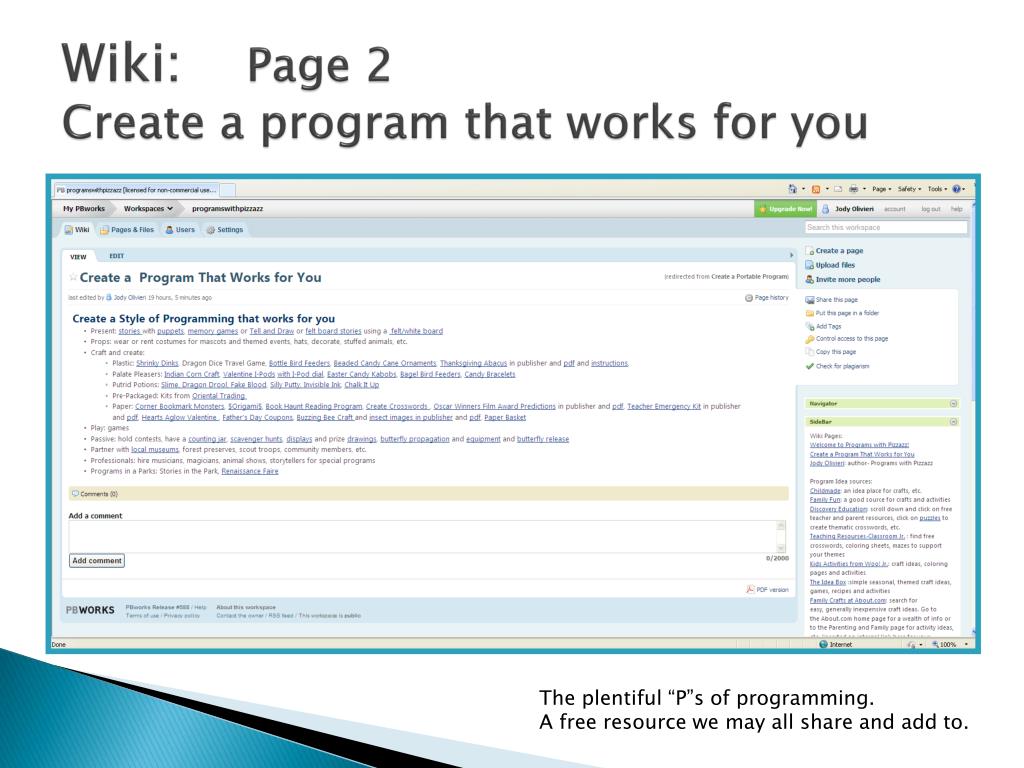 Wiki: Portable Programs with Pizzazz • http://programswithpizzazz.pbworks.com • Jody Olivieri • jodyo@homerlibrary.org