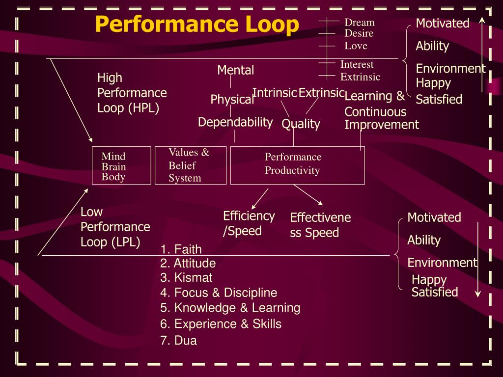 Performance Loop Dream Motivated Ability Environment Desire Love Interest Mental High Performance Loop (HPL) Extrinsic Happy Intrinsic Extrinsic Physical Satisfied Learning & Continuous Improvement Dependability Quality Values & Belief System Mind Brain Body Performance Productivity Low Performance Loop (LPL) Efficiency/Speed Motivated Ability Environment Effectiveness Speed 1. Faith 2. Attitude 3. Kismat 4. Focus & Discipline 5. Knowledge & Learning 6. Experience & Skills 7. Dua Happy Satisfied