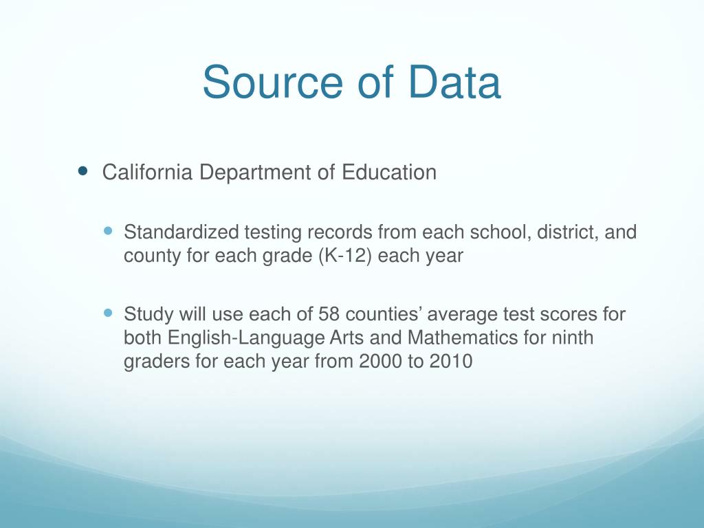 Source of Data • California Department of Education • Standardized testing records from each school, district, and county for each grade (K-12) each year • Study will use each of 58 counties’ average test scores for both English-Language Arts and Mathematics for ninth graders for each year from 2000 to 2010