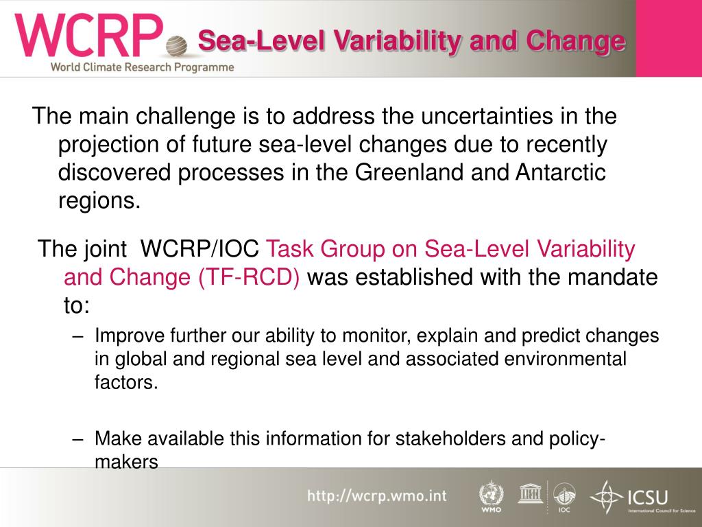 Sea-Level Variability and Change The main challenge is to address the uncertainties in the projection of future sea-level changes due to recently discovered processes in the Greenland and Antarctic regions. The joint WCRP/IOC Task Group on Sea-Level Variability and Change (TF-RCD) was established with the mandate to: • Improve further our ability to monitor, explain and predict changes in global and regional sea level and associated environmental factors. • Make available this information for stakeholders and policy-makers