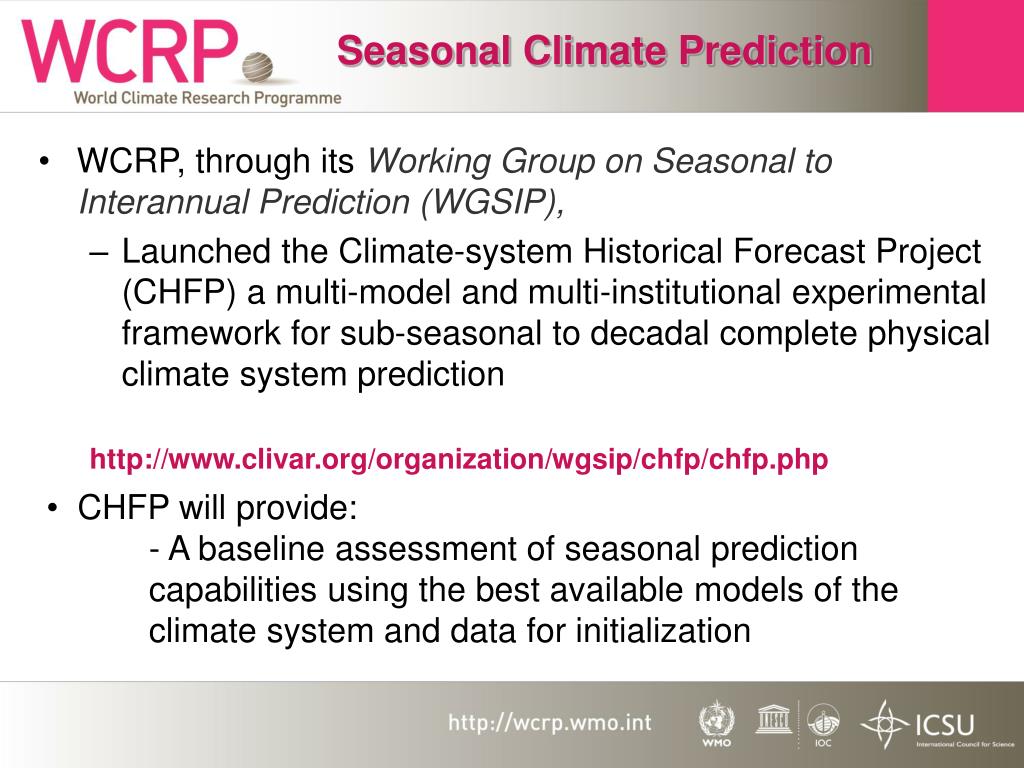 Seasonal Climate Prediction • WCRP, through its Working Group on Seasonal to Interannual Prediction (WGSIP), • Launched the Climate-system Historical Forecast Project (CHFP) a multi-model and multi-institutional experimental framework for sub-seasonal to decadal complete physical climate system prediction http://www.clivar.org/organization/wgsip/chfp/chfp.php • CHFP will provide: • A baseline assessment of seasonal prediction capabilities using the best available models of the climate system and data for initialization