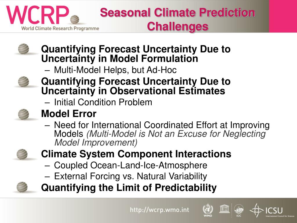Seasonal Climate PredictionChallenges • Quantifying Forecast Uncertainty Due to Uncertainty in Model Formulation • Multi-Model Helps, but Ad-Hoc • Quantifying Forecast Uncertainty Due to Uncertainty in Observational Estimates • Initial Condition Problem • Model Error • Need for International Coordinated Effort at Improving Models (Multi-Model is Not an Excuse for Neglecting Model Improvement) • Climate System Component Interactions • Coupled Ocean-Land-Ice-Atmosphere • External Forcing vs. Natural Variability • Quantifying the Limit of Predictability