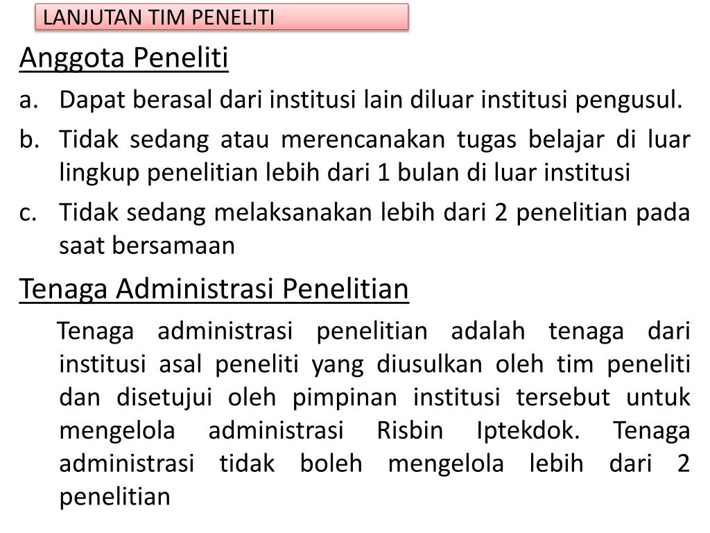 LANJUTAN TIM PENELITI Anggota Peneliti • Dapat berasal dari institusi lain diluar institusi pengusul. • Tidak sedang atau merencanakan tugas belajar di luar lingkup penelitian lebih dari 1 bulan di luar institusi • Tidak sedang melaksanakan lebih dari 2 penelitian pada saat bersamaan Tenaga Administrasi Penelitian Tenaga administrasi penelitian adalah tenaga dari institusi asal peneliti yang diusulkan oleh tim peneliti dan disetujui oleh pimpinan institusi tersebut untuk mengelola administrasi Risbin Iptekdok. Tenaga administrasi tidak boleh mengelola lebih dari 2 penelitian