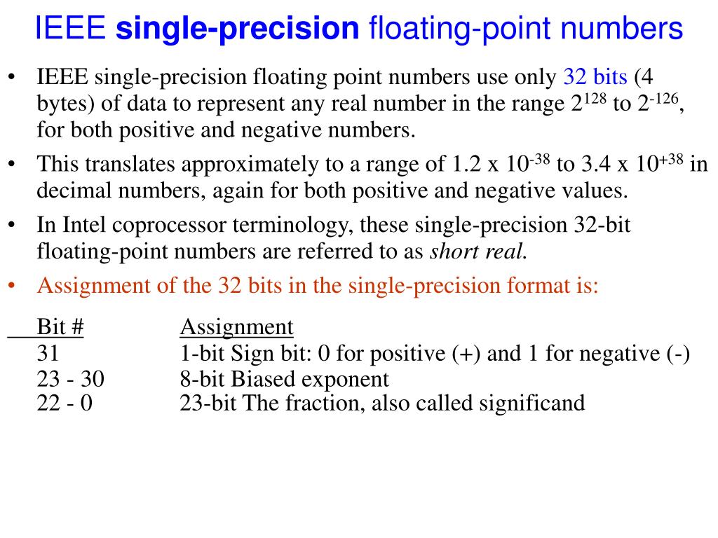 IEEE single-precision floating-point numbers • IEEE single-precision floating point numbers use only 32 bits (4 bytes) of data to represent any real number in the range 2128 to 2-126, for both positive and negative numbers. • This translates approximately to a range of 1.2 x 10-38 to 3.4 x 10+38 in decimal numbers, again for both positive and negative values. • In Intel coprocessor terminology, these single-precision 32-bit floating-point numbers are referred to as short real. • Assignment of the 32 bits in the single-precision format is: Bit #Assignment 31 1-bit Sign bit: 0 for positive (+) and 1 for negative (-) 23 - 30 8-bit Biased exponent 22 - 0 23-bit The fraction, also called significand