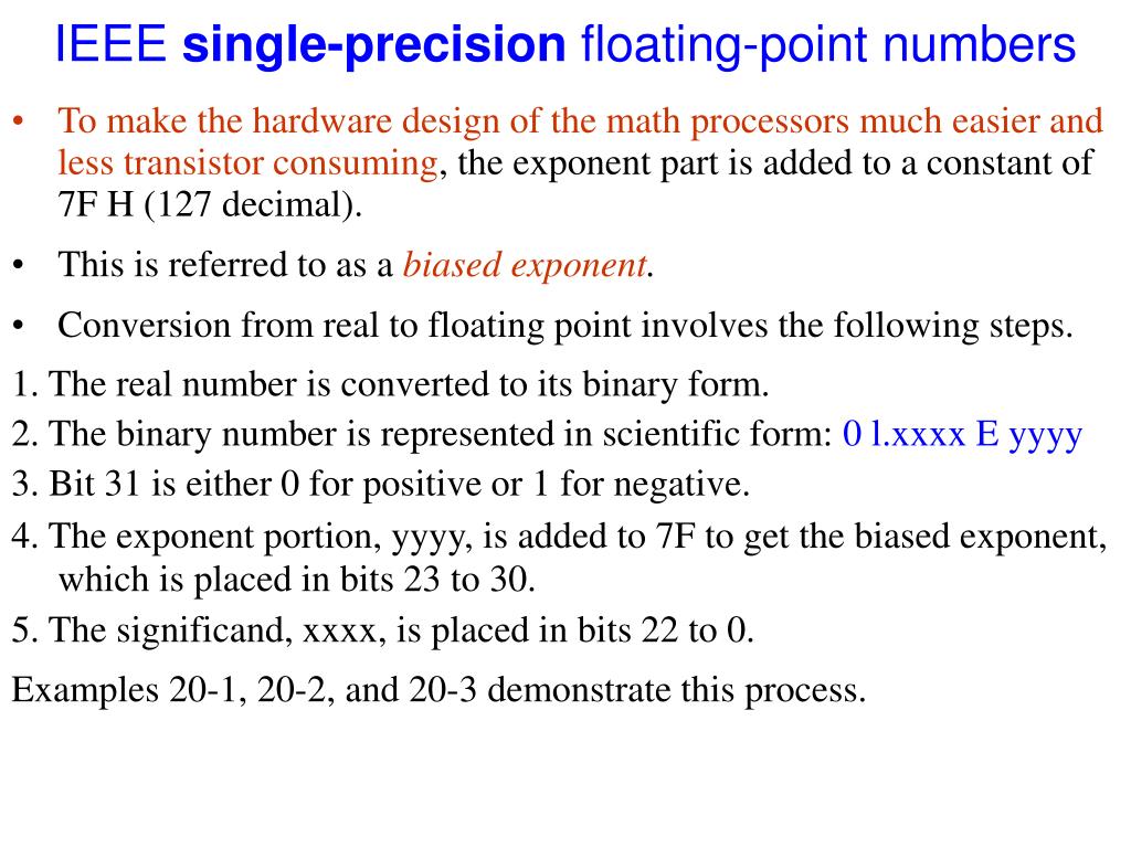 IEEE single-precision floating-point numbers • To make the hardware design of the math processors much easier and less transistor consuming, the exponent part is added to a constant of 7F H (127 decimal). • This is referred to as a biased exponent. • Conversion from real to floating point involves the following steps. 1. The real number is converted to its binary form. 2. The binary number is represented in scientific form: 0 l.xxxx E yyyy 3. Bit 31 is either 0 for positive or 1 for negative. 4. The exponent portion, yyyy, is added to 7F to get the biased exponent, which is placed in bits 23 to 30. 5. The significand, xxxx, is placed in bits 22 to 0. Examples 20-1, 20-2, and 20-3 demonstrate this process.