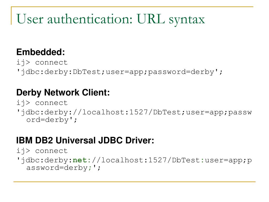 User authentication: URL syntax Embedded: ij> connect 'jdbc:derby:DbTest;user=app;password=derby'; Derby Network Client: ij> connect 'jdbc:derby://localhost:1527/DbTest;user=app;password=derby'; IBM DB2 Universal JDBC Driver: ij> connect 'jdbc:derby:net://localhost:1527/DbTest:user=app;password=derby;';