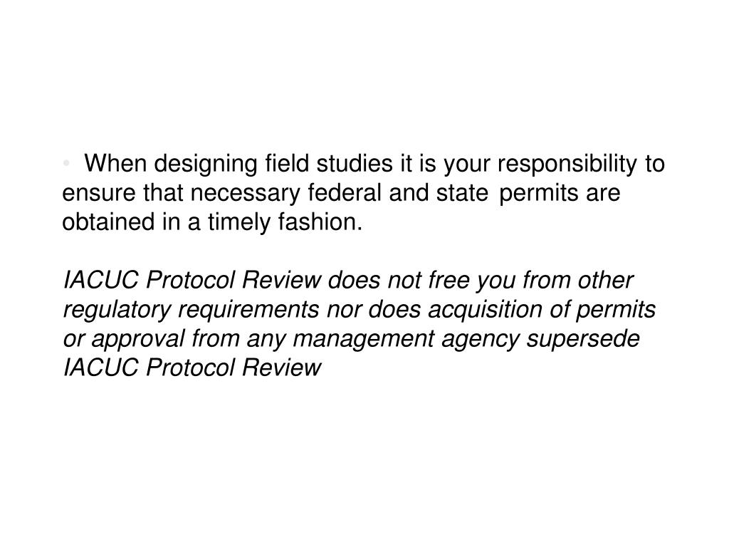 When designing field studies it is your responsibility to ensure that necessary federal and state permits are obtained in a timely fashion. IACUC Protocol Review does not free you from other regulatory requirements nor does acquisition of permits or approval from any management agency supersede IACUC Protocol Review