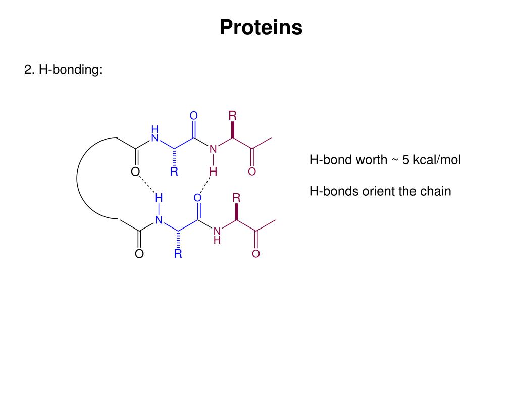 Proteins 2. H-bonding: H-bond worth ~ 5 kcal/mol H-bonds orient the chain
