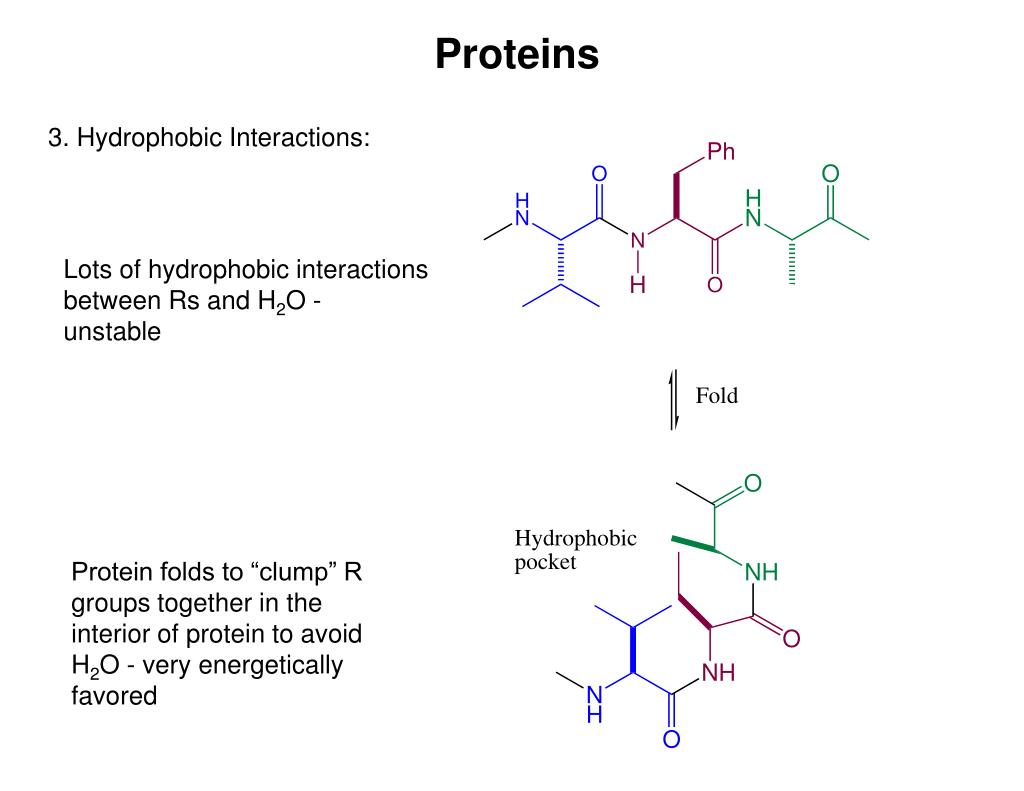 Proteins 3. Hydrophobic Interactions: Lots of hydrophobic interactions between Rs and H2O - unstable Protein folds to “clump” R groups together in the interior of protein to avoid H2O - very energetically favored